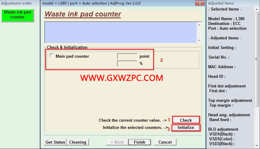 點擊Check按鈕,獲取當前廢墨計數(shù)器的數(shù)值,然后選中計數(shù)器前面的選擇框,點擊Initialization按鈕完成初始化。
