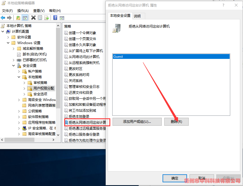 (1)、計算機配置->Windows設(shè)置->安全設(shè)置->本地策略->用戶權(quán)限分配->拒絕從網(wǎng)絡(luò)訪問這臺計算機->刪除Guest