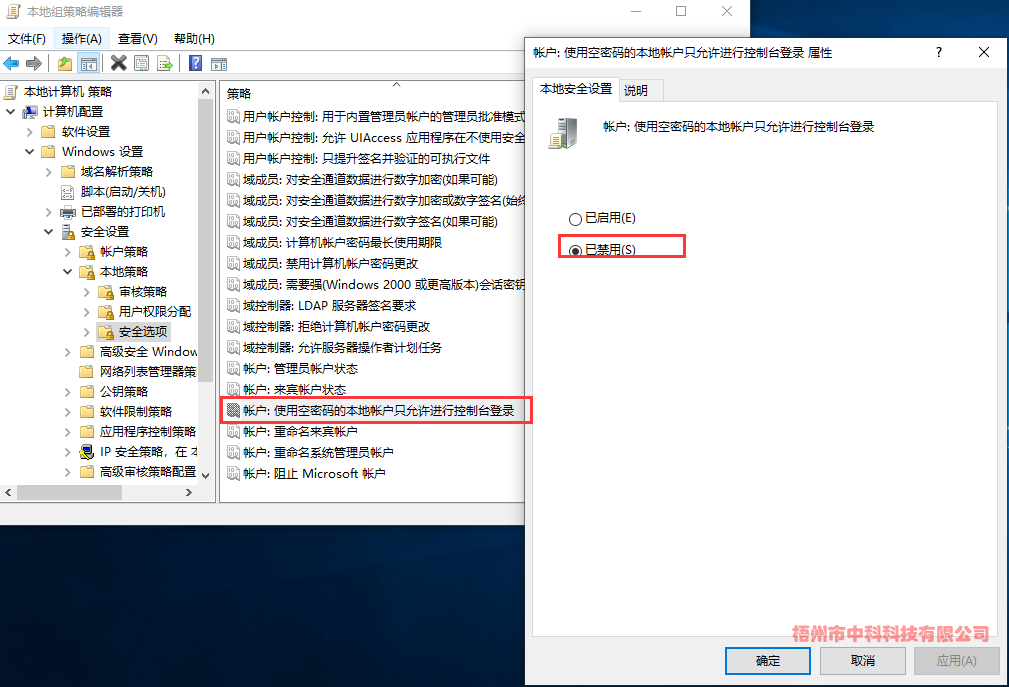 (2)、計算機配置->Windows設(shè)置->安全設(shè)置->本地策略->安全選項->帳戶:使用空密碼的本地帳戶只允許進行控制臺登錄->已禁用