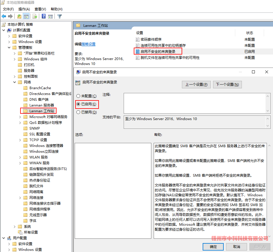 (3)計算機配置->管理模板->網(wǎng)絡(luò)->Lanman工作站->啟用不安全的來賓登陸->已啟用