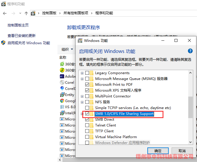 在控制面板中,打開“程序和功能”->啟用或關(guān)閉Windows功能->將“SMB 1.0/CIFS File Sharing Support”勾選->確定
